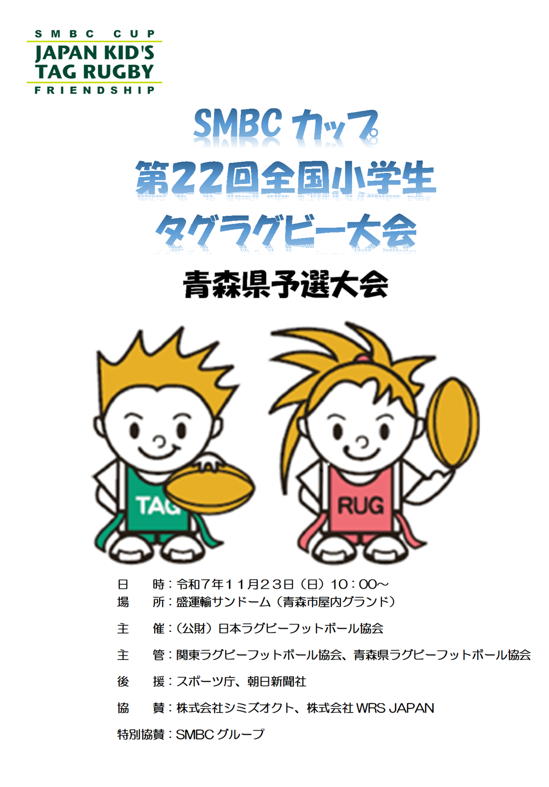 第22回全国小学生タグラグビー大会 青森県予選大会実施要項 お知らせ 2025.10.30 日程は令和7年11月23日(日)となります。 大会要項・参加申し込みは下記のリンクからダウンロードしてください。 第22回全国小学生タグラグビー大会各府県予選実施要項 (青森県予選) 第22回全国小学生タグラグビー大会参加申込書